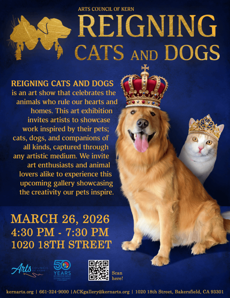 Reigning Cats and Dogs is a playful and heartwarming exhibition celebrating our favorite furry companions. Featuring pet-inspired artwork by talented local artists from across Kern County, the gallery highlights a variety of styles and mediums that capture the charm and personality of cats and dogs. The celebration will also include a lively Pet Parade, inviting the community to show off their beloved companions. Many of the artworks will be available for purchase, making it a fun and meaningful way to support local artists.
